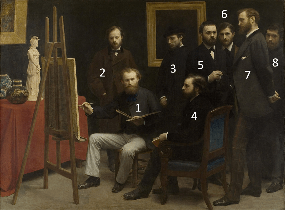 Il fait probablement référence ici au groupe des Batignolles lancé sous l’impulsion d’Edouard Manet (1) qui a déjà acquis une notoriété mondiale. Ce dernier possède un atelier dans le quartier nord de Paris. S’ils passent beaucoup de temps au café Guerbois (aujourd’hui disparu, mais situé sur l’Avenue Clichy), ils se réunissent souvent dans son atelier pour créer, composer et trouver l’inspiration. Ce jour-ci, Manet semble vouloir faire le portrait de Zacharie Astruc (4) qui est assis juste à ses côtés. Zacharie Astruc est un sculpteur, poète, critique d’art, journaliste et peintre. Cet homme est un fervent soutien de ses amis et encouragera grandement le courant impressionniste qui n’en est encore qu’à faire ses armes en essayant de se faire une place dans le monde de l’art. Juste derrière, en tant que spectateurs et proches de Manet, nous retrouvons une belle bande d’artistes : Otto Scholderer (2); Auguste Renoir (3), Emile Zola (5), Edmond Maître (6), Frédéric Bazille (7) et Claude Monet (8). S’il est fort peu probable que tout ce beau monde se soit tenu ainsi en ayant pris la pose durant d’interminables heures comme ce fut le cas pour Astruc, nous ne pouvons qu’imaginer l’effervescence créative ayant dû animer ces journées entières passées dans cet atelier. Qui ne rêverait pas, après tout, de se retrouver entre un Emile Zola vrombissant et un Renoir attentif ?