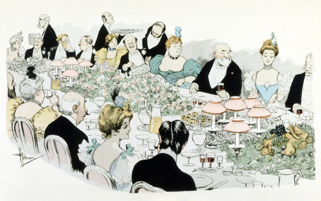 L’univers mondain n’est pas en reste et prend également forme grâce aux traits malicieux d’Albert Guillaume. Les occasions ne manquent pas et Guillaume sait de quoi il traite puisqu’il fait lui même partie de cette société parisienne et bourgeoise. Les bals, les soirées, les salons, les restaurants, deviennent ses lieux de prédilection pour représenter des couples dysfonctionnels et souvent drôles à leurs dépens. C’est ce qu’on appelle le ridicule de la vie en société ou la satire sociale. Tout le monde en prend pour son grade et les sourires sont nombreux à apparaître en découvrant les illustrations présentes dans « Madame est servie » ou « Étoiles de mer ».