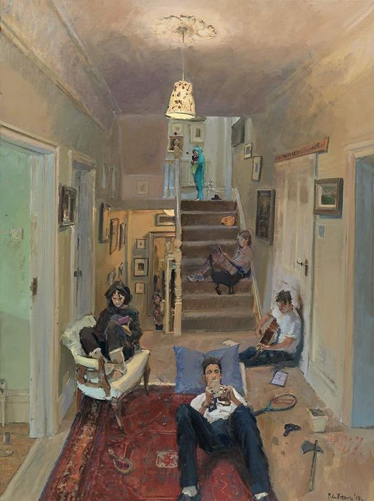 Pour celles et ceux qui ont déjà pu parcourir mes livres, vous aurez sans nul doute remarqué à quel point la thématique familiale est prépondérante dans mes récits. Ce qui me plait dans ces histoires familiales, c’est justement de pouvoir créer des situations entre des personnages connectés les uns aux autres pour le meilleur comme pour le pire. Il y a en plus quelque chose d’assez fantastique, je trouve, dans la représentation que nous pouvons nous faire d’une cellule familiale. La maison, comme espace physique, représente l’élément permettant toutes les multiples interactions entre des individus différents et parfois obligés de coexister. En découvrant les œuvres familiales de Peter Brown, j’ai réellement eu le sentiment de retrouver toutes ces choses qui me fascinent depuis longtemps. J’ai aussi l’impression de découvrir les personnages de mes romans, comme si l’artiste avait réussi à les retranscrire fidèlement. Je crois en réalité que ces peintures parleront à toutes celles et ceux qui ont un jour connu des maisons réunissant des fratries petites ou grandes. Ici, le décor semble à chaque fois prendre vie dans un écrin toujours affectueux et empreint d’une tendresse particulièrement touchante. Il n’est pas difficile d’entendre les bruits de pas sur le sol, les disputes fraternelles ou les nombreux rires d’enfants.