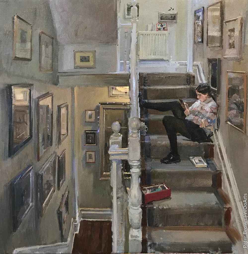 Si la maison est le lieu permettant à Peter Brown de situer ses œuvres. Il existe également une autre figure centrale et majeure : l’escalier. Il serait néanmoins juste de parler également d’un escalier se trouvant dans un hall nous ramenant directement aux images que nous pouvons nous faire des intérieurs britanniques. Néanmoins, je retrouve dans cet espace un véritable centre d’échange, de rencontres ou même de confrontations. C’est un lieu commun emprunté par tous. Et dans ses toiles d’une infinie justesse, Peter Brown montre à quel point l’escalier devient littéralement un salon, une salle de jeu ou un coin de lecture permettant à ses enfants d’interagir les uns avec les autres.