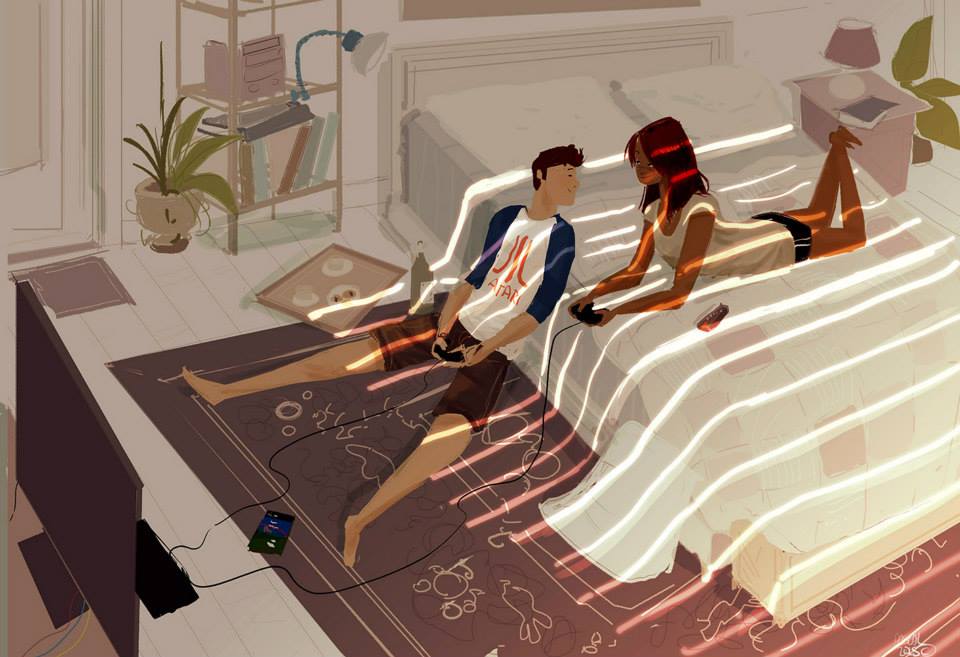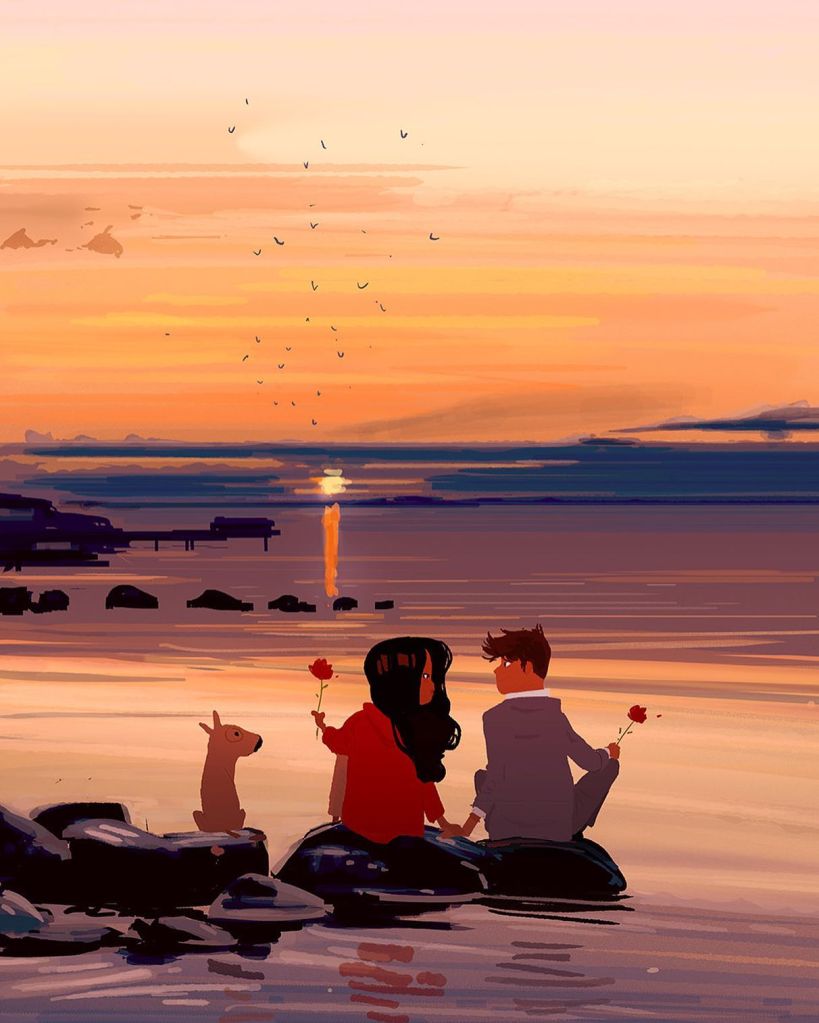 Cela ne fait absolument aucun doute, les illustrations de Pascal Campion s’inscrivent parfaitement dans un genre romantique. Les différentes palettes de couleurs, si elles restent la plupart du temps dans des tonalités pastels, nous laissent toujours entrevoir des instants touchants. Une fois encore, l’immersion est totale et nous découvrons ainsi le couple dans leur plus belle intimité. Un coucher de soleil, un baiser sous la pluie ou un moment anodin devant un film, absolument tous les moments partagés peuvent faire l’objet d’une illustration en étant à tout jamais immortalisés. N’est-ce pas, après tout, l’objectif même de l’art ?