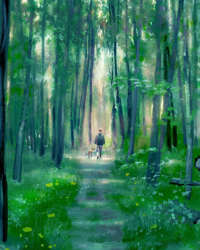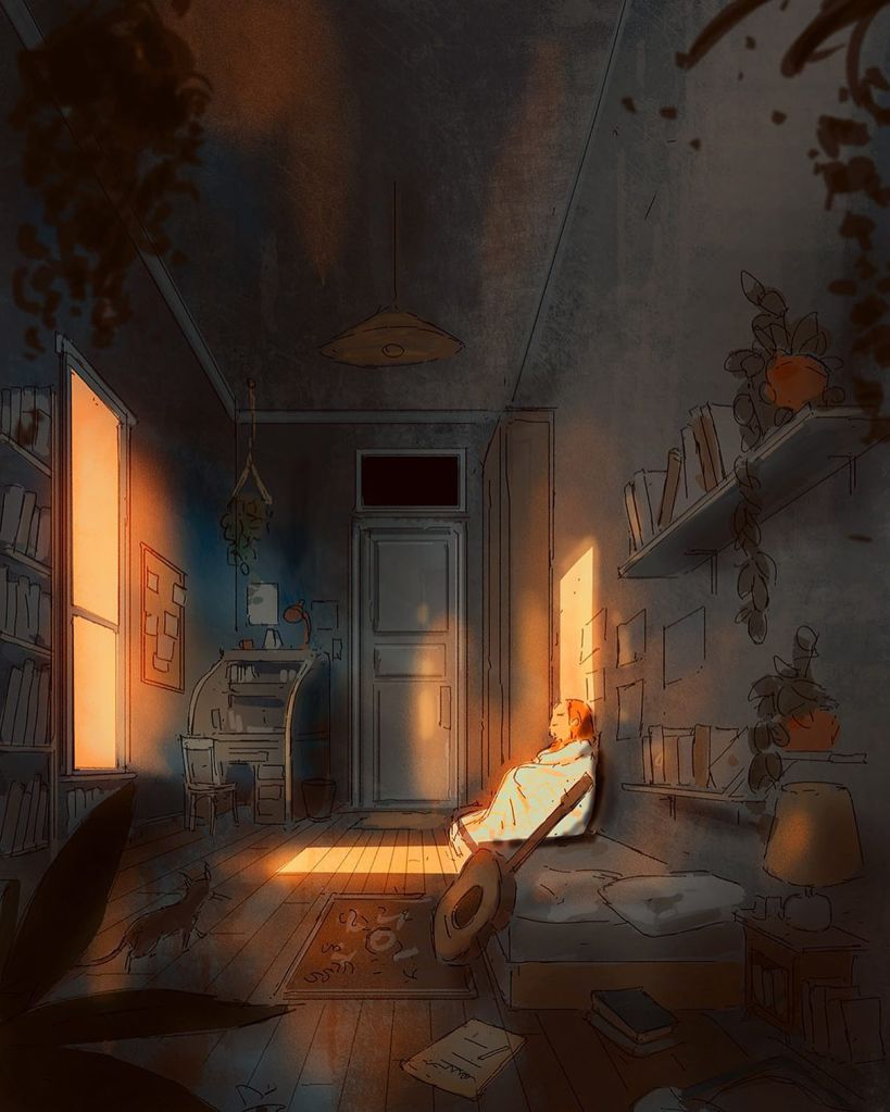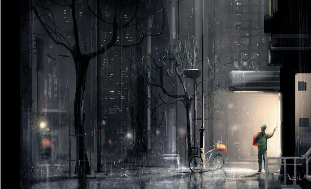 La couleur est toujours d’une incroyable justesse, permettant ainsi à celles et ceux qui contemplent ses œuvres, de pouvoir littéralement s’immerger dedans. Son talent réside notamment dans le fait que nous ne pouvons nous empêcher de nous mettre à la place de ces personnages présentés. Ces instants sont comme des moments de mémoire partagés. Nous avons tout simplement l’impression de les avoir vécu ou de faire partie intégrante de sa vie. Les traits sont toujours précis sans pour autant verser dans un réalisme excessif ; empruntant ici bien plus volontairement à des visuels habituellement vus dans les films Dreamworks ou les Disney pour lesquels il lui arrive justement de collaborer. Mais si le dessin paraît s’adresser à des enfants, il n’en reste pas moins destiné à tous les publics, adultes en premier. Il semble alors régner – même dans les œuvres les plus sombres – des éléments réconfortants et tendres. L’artiste parvient ainsi à véhiculer de nombreux messages et ces derniers ont notamment fait partie de quelques illustrations produites lors des confinements dus au COVID. Dans l’œuvre ci-dessous, il parle justement des personnes qui ont continué de livrer durant l’épidémie ; ces petites mains grâce à qui de nombreux habitants cloisonnés à travers le monde ont pu bénéficier de repas et un peu d’humanité.