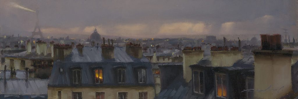 Animé par le désir de perfectionner son art et d’explorer la riche tradition de la peinture, Carter a poursuivi un baccalauréat en beaux-arts en peinture à l’Université du Montana. Pendant ses études de premier cycle, il s’est lancé dans un voyage transformateur à l’étranger, passant un an dans le nord de la France à s’immerger dans la langue, la culture et le patrimoine artistique de la région. Il en ressort aujourd’hui, chez lui, quelques oeuvres particulièrement intéressantes, prenant toujours soin à saisir les toits de la ville lumière.